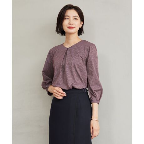 繊細なピンストライプ柄が上品なVネックカットソー。襟ぐりは浅めのVネックなので、開きすぎずデコルテを綺麗に見せてくれます。前後の衿元にタックを入れ立体感を出しているため体のラインを拾わず、袖口にもタックを入れ、ふんわりと女性らしい印象に仕上げました。着心地が良くシワになりにくいジャージ素材のため、デイリー使いや通勤着にもぴったり。1枚着としても、ジャケットやカーディガンなど羽織りのインナーとしても合わせやすく、持っておくと重宝する万能アイテムです。通年使いやすい定番のネイビー(175)、ライトグレー(103)に加え、深みのある秋らしい色合いのワイン(115)、グリーン(160)の計4色で展開しています。