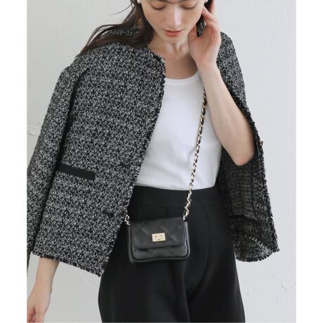 ゴールドチェーンの持ち手が、コーディネートに華やかさをプラス。