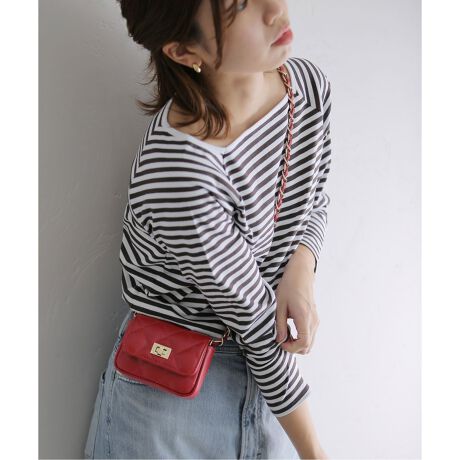 ゴールドチェーンの持ち手が、コーディネートに華やかさをプラス。