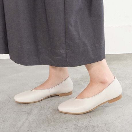 履き口のVカットが足元をすっきり見せてくれて、フラットでもラフになりすぎないのが魅力。