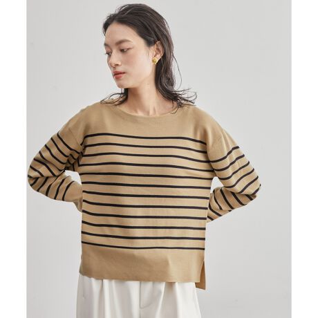 透けにくい厚みのある総針で編立てたプルオーバー。重くならずに目面が綺麗なのは細番手ならではの魅力です。シンプルなボートネックの長袖プルオーバーはすっきりとしたシルエットでサイドスリットで抜け感を。流行に左右されることなく着ていただけます。キャメルはコートのインナーとしても映えるパネルボーダーで、トラッド気分を取り入れて。