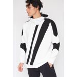 エッジの効いたカッティングをジオメトリックに配置したモノトーンバイカラーフーディ。