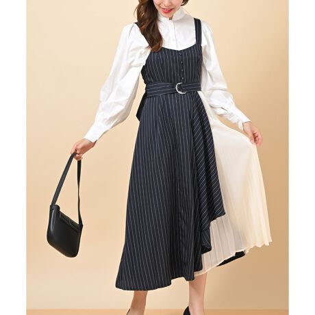 シフォンプリーツをのぞかせたアシンメトリーなジャンスカワンピ。