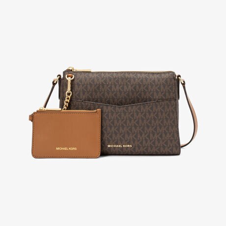 コンパクトなサイジングと気品漂うMKシグネチャーパターンがフェミニンな魅力を放つ KAYLEE(カイリー) 2 IN 1 クロスボディ スモール。インテリアには便利なドロップポケットを備え、お出かけの必需品をすっきりと収納。フロントのオープンポケットにチェーンリンクで繋がれた付属のポーチをしのばせれば、さりげないコントラストも楽しめます。