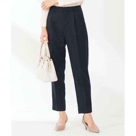 ■デザインタックデザインの入ったきちんと感のあるテーパードパンツです。ウエスト後ろ部分はゴム仕様なので、楽ちんな穿き心地に仕上がっています。同素材のジャケットとセットアップでの着用もオフィススタイルにおすすめです。