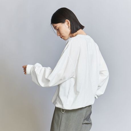 クルーネックのロングスリーブTシャツの裾に、ゴムドローコードを入れたユニークなアイテム。