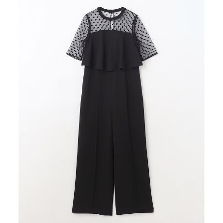 大人の華やぎを演出してくれる綺麗見えサロペット。上質感のある梨地ダブルフェイス素材を使用し、ヨークと袖にオリジナルのフロッキードットチュールをドッキング。色気のあるシアーな透け感が、大人っぽく上品な印象を添えます。ゆったりとしたワイドパンツ型でリラックスして着て頂ける一枚に仕上げました。上身頃のレイヤード切替えによって、すっきり足長シルエットを表現。シンプルな中に華やかさがあり、フォーマルな場面にぴったりな一品です。