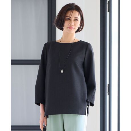 イージーケアなキレイめブラウス■デザインハリ感とふくらみ感のある素材ならではの、程よく立体的なフォルムでボディラインを拾いにくいブラウスです。後ろに向かって緩くカーブにし、ややフレアにした裾がヒップラインをカバーしてくれるバランスに仕上げました。同素材のパンツ(PRWRSA0203)と合わせてセットアップでの着用もおすすめです。■素材程よい凹凸感のあるハニカム組織が天然素材のような印象のポリエステル素材です。ドライな糸を使用しているのでシャリ感があり、サラッとしたタッチが心地よく、シワになりにくく、速乾性があります。■同素材アイテムパンツ(PRWRSA0203)