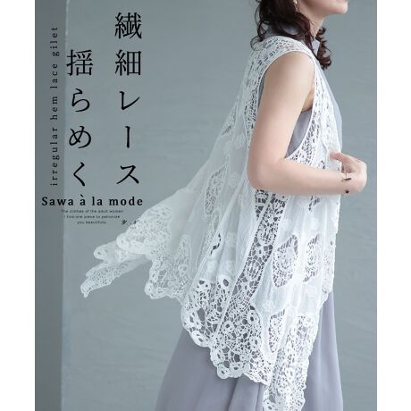 【ジレ】 アウター カーディガン ベスト 白 ホワイト ノースリーブ レース 綿 コットン 重ね着