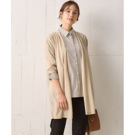■デザイン長めの着丈でヒップラインもしっかりカバーするロングカーディガン。首回りの日焼け対策にもなるように、後衿はスタンドネックシルエットにしています。内側に織り込みVネック見えする衿とドレープ感が衿まわりをすっきりと見せてくれます。適度なドレープ感や深めの脇スリットでさらりと羽織れるシンプルなデザインに仕上げています。脇ポケット付きです。