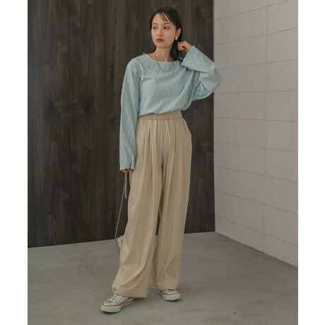 しゃかしゃかとした落ち感ある素材感が今年らしい印象のセミワイドパンツ。形がとにかく綺麗で、すとんと落ちるシルエットがほどよい抜け感を出してくれます。ウエストはゴムになっているのでストレスフリーで着用できるのも嬉しいポイント。身体に張り付かず、夏場でもさらっと着用出来るので、今からのシーズンにオススメです。シンプルなデザインなので、トレンドに関係なく、長く愛用して頂けます。