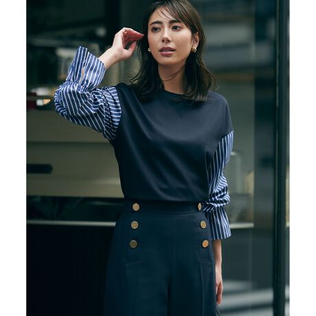上品な光沢とサラッとした肌心地の繊細なツイルジャージー素材。程よいハリと肉感で、体のラインを拾わずシルエットが楽しめる安心の素材です。袖にコンビで使用しているシャツ地は、滑らかでハリのある素材で、デザインに広がりを加えています。配色使いで、まるでレイヤードしているかのようなコーディネートを楽しめる1枚です。