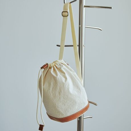 フラットな表情のタフタ素材にシワ加工を施し、ドライで軽さとタフさを兼ね備えた巾着タイプのバッグ。
