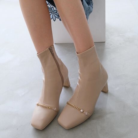 華奢なチェーンとワンポイントのパールが上品で大人かわいいショートブーツ。