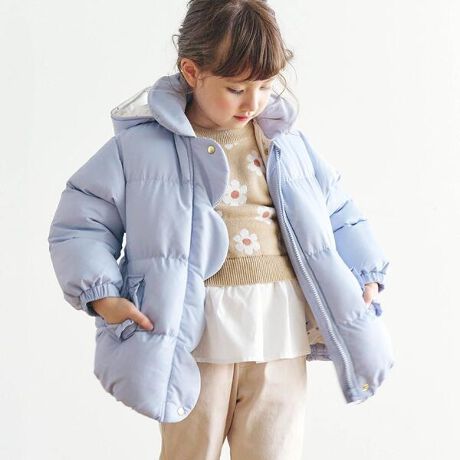 合わせの部分がスカラップデザインになったかわいらしい中綿アウタージャケットが登場?裏地のハート模様もとってもかわいくフードの取り外しも可能です◎