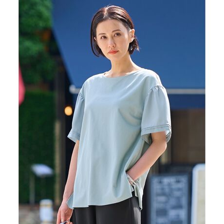 女性らしいラッフルスリーブトップス■デザインシンプルなボックスシルエットに、肩から垂れるラッフルスリーブが女性らしい印象のトップスです。袖は柔らかく繊細な別生地で合わせ、袖口には繊細なタックを施しています。ボトムを選ばずコーディネートしやすいトップスです。グレイッシュミント(062)はWEB限定カラーとなります。■素材ソフトで軽いタッチですが、透けにくい素材です。ウォッシャブルで吸水速乾、UVカットに優れ、適度なハリ感があります。■同素材アイテムバンドカラーチュニック丈カットソー(KKWMSA0231)