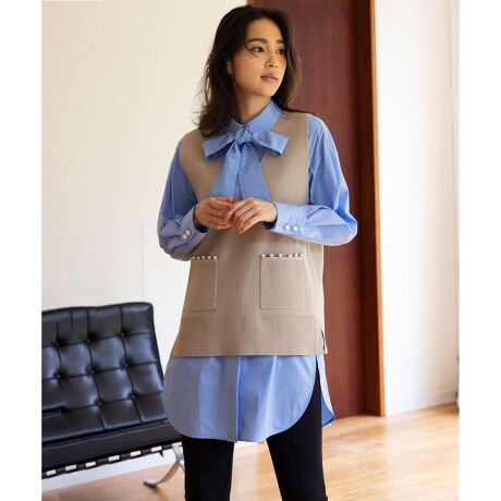 ■デザインおしりをすっぽり隠すチュニック丈のオーバーシャツは、絶妙なサイジングとフォルムを際立たせるため、シンプルなデザインに。後ろヨークにたっぷりと入れたギャザーでかっちりと見えがちなシャツ地にやわらかさ与え、襟元の決まりが良いような襟のパターンにし、第一釦の位置を通常より少し下げることでボーイッシュになりすぎない女性らしさと抜け感をプラスしました。今季、ベストとのスタイリングが特におススメで、気分を変えてブーツとの合わせでミニワンピース風にもお楽しみいただけます。