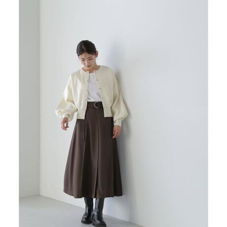 [design & styling]斜めに入ったタックのラインがシンプルながらほど良いアクセントをプラスしてくれるフレアスカートは、共布のDカンベルトをサイドに垂らした抜け感あるスタイリングがおすすめ。ウエストラインはすっきりしつつ、揺れ感のあるフレアシルエットが女性らしさを演出してくれます。合わせるトップスを選ばず、カジュアルからきれいめまで幅広いスタイリング楽しめる着回し力抜群の1枚。左ファスナーで着脱[fabric]秋口から使いやすい肉感で、程よく落ち感のあるツイル素材を使用しています。※裏地付き※モデルの着用画像の場合、光の当たり具合により、実際の色味と異なって見えることがございます。色味は、商品単体の画像をご参照ください。