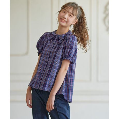 ■デザインオリジナルのチェック柄を使用したブラウスです。ゆったりとしたAラインシルエットとボウタイのような衿がポイントです。晩夏から初秋にかけて着用していただけるよう5分袖のお袖になっております。