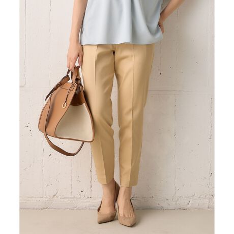 ■デザインベーシックなテーパードシルエットのクロップドパンツは、脚を細く・長くみせてくれる立体パターンで、すっきりとした細身のシルエットを叶えてくれます。センタープレスでかっちりとした通勤シーンに着用していただけるのはもちろん、程よい光沢と表面感なので、カジュアルアイテムとの着合わせにもハマってくれる汎用性の高いアイテムです。