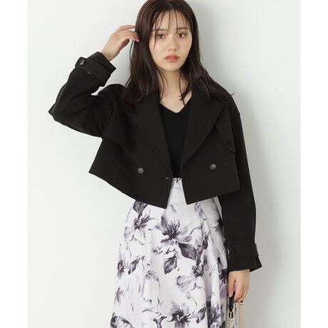 【商品特徴】今年らしいショート丈のトレンチディテールジャケット。短丈なので、ハイウエストのボトムスやフレアスカートと合わせれば、シルエットがすっきり見えるバランスです。しっかりとした素材感のため、秋から長く着ていただけます。【スタイリング】シンプルなスカート合わせはもちろん、総柄スカートと合わせれば、柄が引き立つコーディネートが完成します。