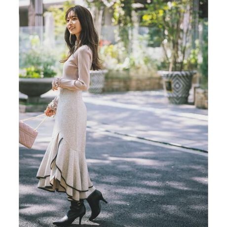 【商品特徴】歩くたびに揺れるイレギュラーのティアードラッフルヘムが華やかなスカート。裾のラッフルデザインの縁には、配色パイピングを施して目を引くアクセントに。ハイウエストで腰まわりをすっきりまとめ、メリハリのある女性らしいシルエットを演出します。ツイード調の表面感のある素材を使用、品よくシーズンムードを高めてくれる一枚。【スタイリング】華やかなブラウス、キレイめニット、シンプルニットプルオーバーまで着回しできます。足元はブーツを履くとバランスが取り入れやすいです。