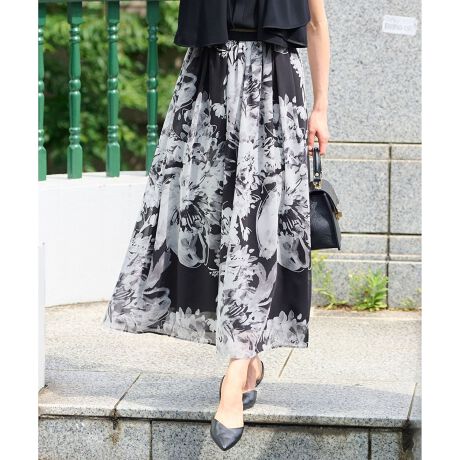 Made in Japanにこだわった華やかな花柄スカート■デザイン海外のアトリエ図案をアレンジした大胆な花柄で、手描き風タッチが華やかな大人のプリント柄スカートです。軽やかなシフォン素材を生かし、ランダムタックとギャザーの入った、揺れるたびに表情のあるきれいなデザイン。ウエストはラメラインを効かせたゴムを使用しているので、快適な履き心地です。大胆で華やかな大きめの花柄プリントは、シンプルなトップスに合わせてコーディネートの主役にしたい1着です。■素材膨らみ感とパウダリーな肌触りの良さが特徴の素材です。生地・プリントともに、Made in Japan素材です。