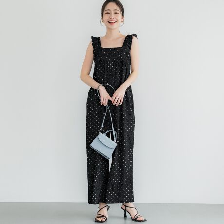 ショルダーフリルがカジュアルになりがちなオールインワンにガーリーさをプラス。