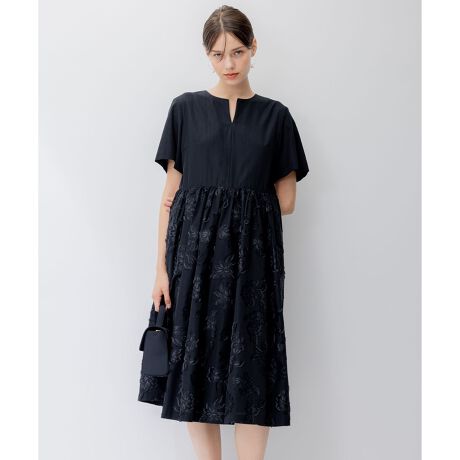 華やかな花柄のジャカード素材を使用したブラックドレス。上身頃は同素材の無地を使用しすっきりと仕立て、スカート部分はボリュームを持たせ華やかさを加えたデザインです。