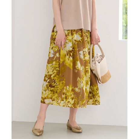 Made in Japanにこだわった華やかな花柄スカート■デザイン海外のアトリエ図案をアレンジした大胆な花柄で、手描き風タッチが華やかな大人のプリント柄スカートです。軽やかなシフォン素材を生かし、ランダムタックとギャザーの入った、揺れるたびに表情のあるきれいなデザイン。ウエストはラメラインを効かせたゴムを使用しているので、快適な履き心地です。大胆で華やかな大きめの花柄プリントは、シンプルなトップスに合わせてコーディネートの主役にしたい1着です。■素材膨らみ感とパウダリーな肌触りの良さが特徴の素材です。生地・プリントともに、Made in Japan素材です。