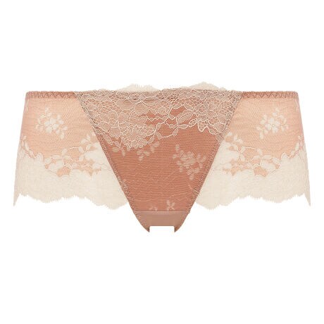 身生地は編みレースを使用しているので、軽やかなはきごこち。ローライズのボトムにも対応できるヒップハンガータイプです。