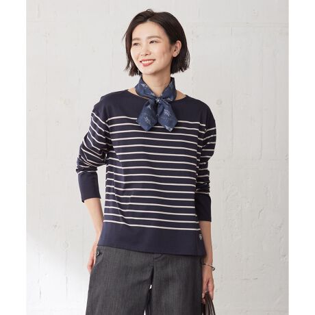 裾の小さなワッペンが特別感を演出する、定番型カットソー。洋服の上部と裾の無地とボーダー柄のバランスと、太さやピッチにもこだわったオリジナルなパネルボーダーを作りました。インでもアウトにしても様になる丈感とシルエットで、スタイリングの幅が広がるイチ押しアイテムです。