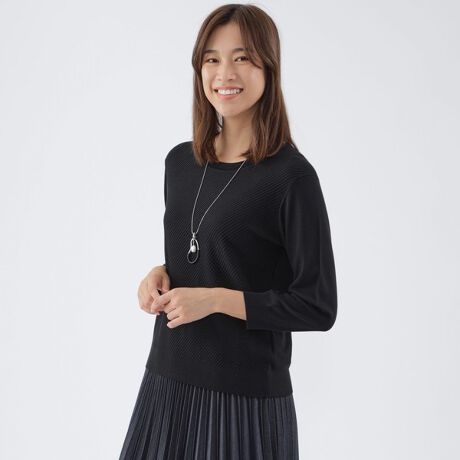 シンプルデザインなだけに前身頃のバイヤス柄、襟元リブのアイレット柄が際立ち、コーディネートのポイントになるプルオーバーに仕上げました。薄手でさらっとした素材ですので、一枚で着映えるプルオーバーとしても、ジャケットやアウターのインナーに編地が映えるインナーとしてもお使いいただける万能ニットです。