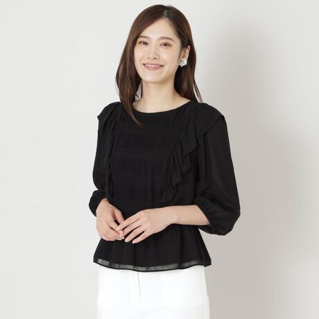 前身頃はマジョリカプリーツを寄せたパーツをはめ込み、