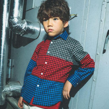 3色のチェック柄をランダムに切り替えて男の子の発想力豊かな工作をイメージした長袖チェックシャツ。