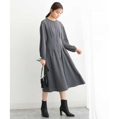 ウエストにタックを施したデザインでスタイルアップが叶うきれいめワンピース。衿にはパール調釦をアクセントにし、華やぐ印象に。前釦なので着脱のしやすさも◎