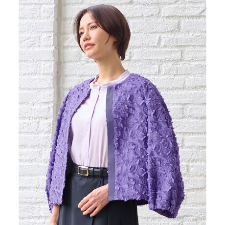高級感のあるカットジャガードが映えるノーカラージャケット■デザインボクシーなシルエットと程よくボリュームのある8分袖が女性らしく、華やかなジャケットです。衿ぐり、前端には同色のグログランテープを施してさりげないポイントにしています。軽く、薄い素材に仕上げているので暑さの残る時期から着用でき、自由区らしい素材の高級感を感じる、1枚で着映える羽織りです。■素材自由区オリジナル柄のカットジャガードです。程よい光沢と、軽やかで柔らかい薄地でありながらも適度なハリのある高級感を感じられる素材です。■同素材アイテムワンピース(OPWMSA0202)スカート(SKWMSA0202)