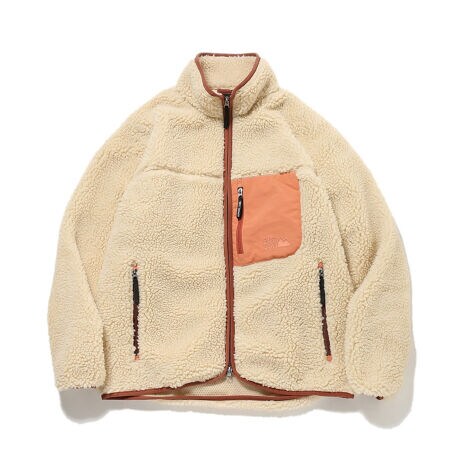 暖かみのあるモコモコのボアと、アウトドア感を演出する左胸のナイロンポケットが特徴的な1着。