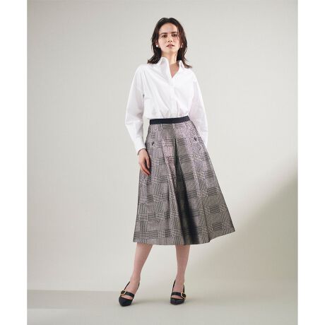 インポートならではの美しくエレガントな素材に心惹かれる、クラス感溢れるスカート。イタリアの“SILKOMO”(シルコモ)社のラメグレンチェックジャガード地を贅沢に使用した、大人の品格漂う一枚です。ハリ感のある素材、そしてタックを入れて美しいボリュームシルエットを表現しました。コーディネートの主役としてご活躍いただける一品です。
