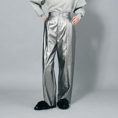 ハイウエストと切り替えラインで脚長効果抜群の合皮パンツ。