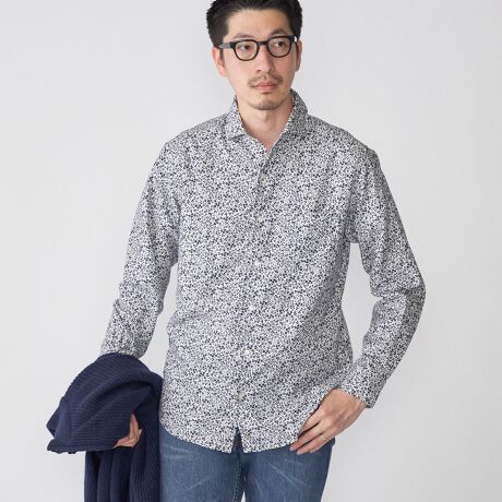 小花柄のデザインは一枚ではもちろん、ジャケット等のインナー使いとしても、コーディネイトのアクセントに最適なシャツです。