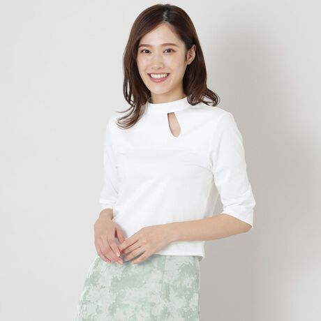 胸元のオープンデザインが印象的な7分袖のスタンドネックカットソーです。洗練された上品なデザインカットソーに仕上げて、インナーとしても使いやすいように設計しました。コンパクトな形はスカート、パンツを問わず、幅広いシルエットのボトムと相性が良く、着回し万能なアイテムに仕上げています。
