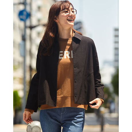 ゆったりしたシルエットで軽く羽織れるシャツジャケット。二酸化炭素と水質汚染を通常の50%軽減するサステナブル素材をつかっています。