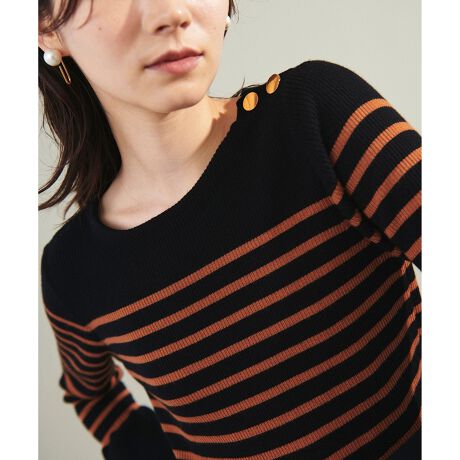 冬に着たい、マリンボーダーニットトップス。ウール100%の総針編み地で袖口をベルスリーブに切り替えてアクセントをプラス。左肩にはメタルボタンをトッピングしてカジュアルさを抑え、品の良いデザインに仕上げました。モノトーンボーダーのホワイト、大人のシックなスタイリングにぴったりなブラウン、差し色にぴったりな無地パープルの3色をご用意しました。