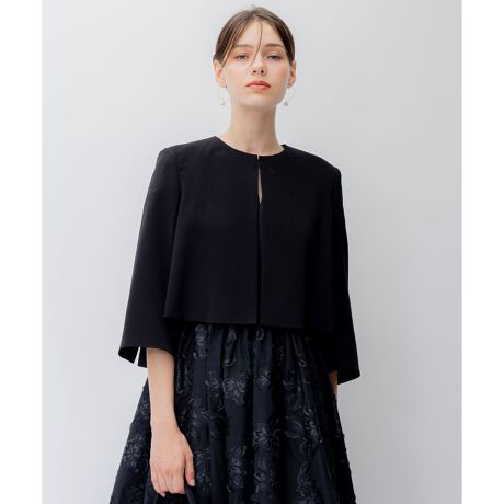 バックにタックでボリューム出したレングス短丈ジャケット。ドレス合わせにバランスのいい広がりすぎない分量感、レングスにこだわりました。