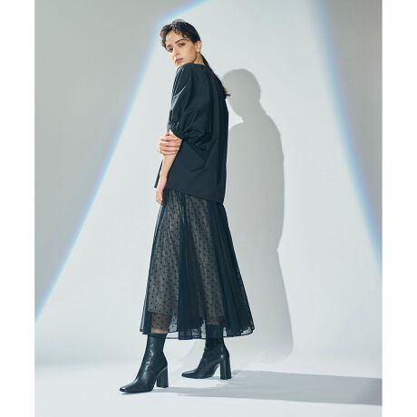 メッシュ素材とドットチュールを重ねたレイヤードロングスカート。