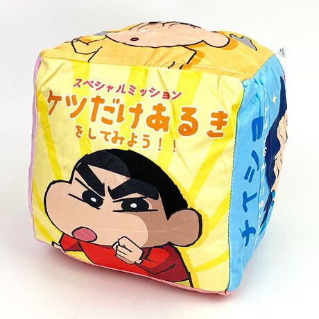 クレヨンしんちゃんのサイコロクッション。お家で転がして遊べます。ふわふわの肌触りで癒しのアイテム♪