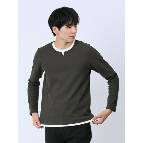 トップスを二枚重ね着したように見える、キーネックの長袖ニットソーです。重ね着したように見える、衿元のフェイクレイヤードがアクセントになっています。一枚で着るのはもちろん、ジャケットやシャツ、ベストのインナーとしても便利なアイテムです。