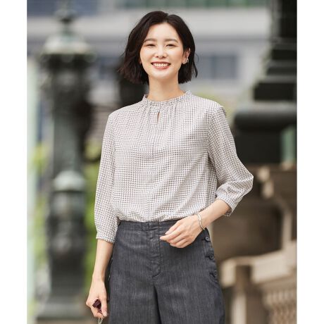 薄く、軽い素材ながらも密度があるため、落ち感とドレープ性に優れたブラウス見えする素材に、秋冬のトレンドのガンクラブチェックを変形させてプリントしました。シワが目立ちにくく、取り扱いも容易な点が特徴です。