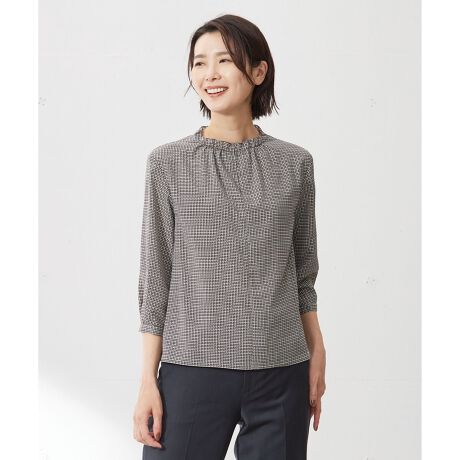 薄く、軽い素材ながらも密度があるため、落ち感とドレープ性に優れたブラウス見えする素材に、秋冬のトレンドのガンクラブチェックを変形させてプリントしました。シワが目立ちにくく、取り扱いも容易な点が特徴です。